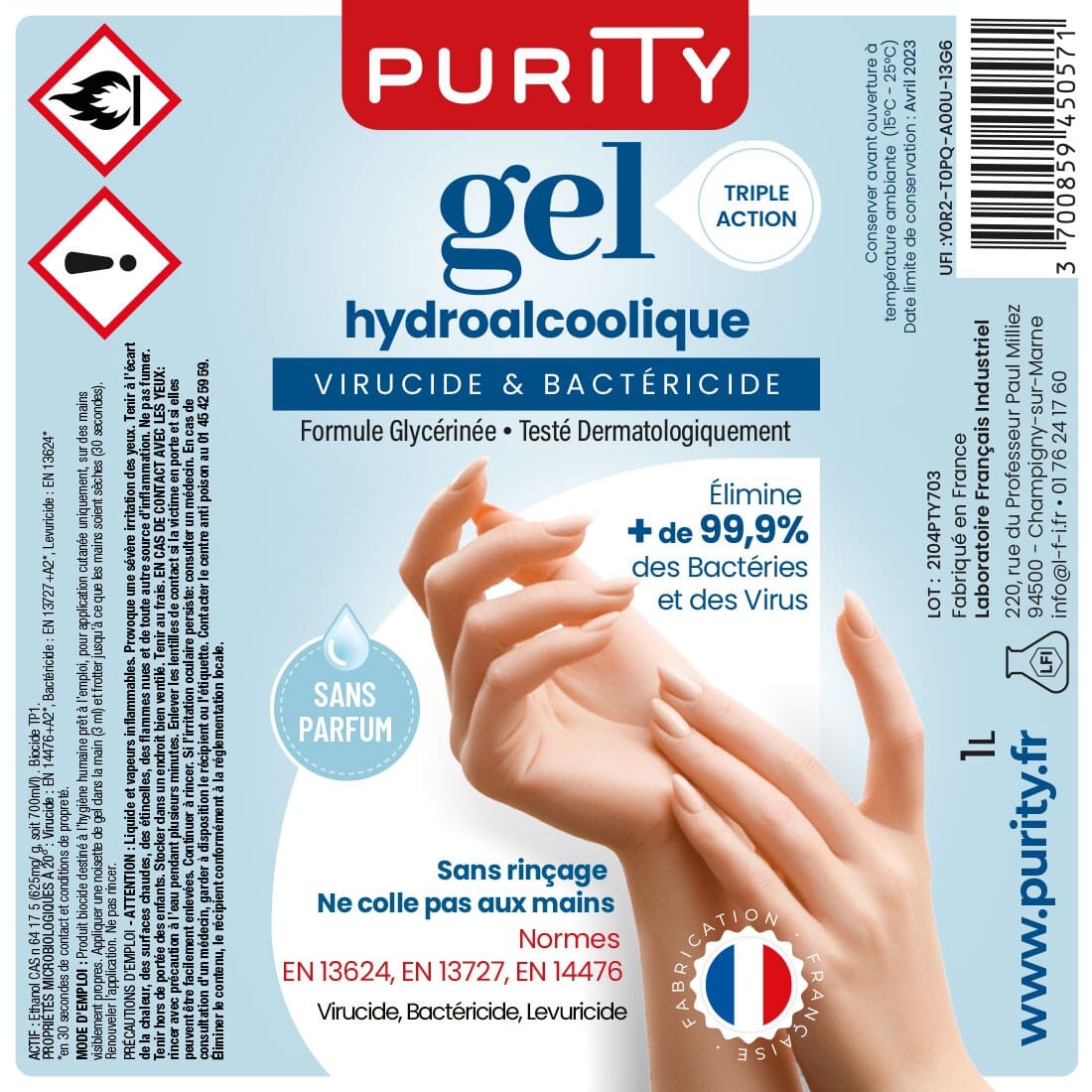 Flacon pompe de 1 litre de gel hydroalcoolique Purity 703.